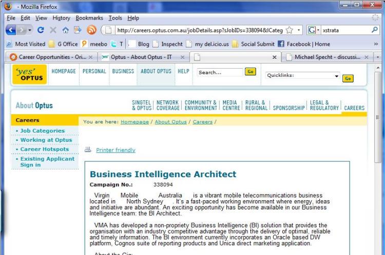 I was reviewing the Optus careers web site and went to review a listing of jobs and I opened the third job listed within the IT group, one for a Business Intelligence Architect.